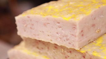 肉糕,常见于酒席上,在生活条件不好的年代,要办酒桌的话肉量要的大,而肥肉吃的人又少,所以就有人发明了肉糕,将肥肉打成泥,再加上淀粉和各种调味品改山打成糕状,放入蒸笼里,表层涮上蛋液,蒸熟后切成片,再做成扣碗,像极了肉片,而且吃起来又不腻,还挺体面,所以是酒席上常见的菜。